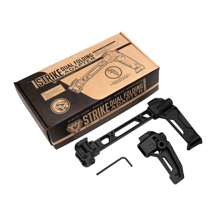 Strike Dual Folding Adapter on markkinoiden ensimmäinen patentoidun järjestelmän omaava tuote, joka tarjoaa intuitiivisen avautumisjärjestelmän Picatinny-liitännälle. Tämä sovitin taittuu vasemmalle tai oikealle milloin tahansa ilman, että saranaa tarvitsee kääntää tai konfiguroida uudelleen.