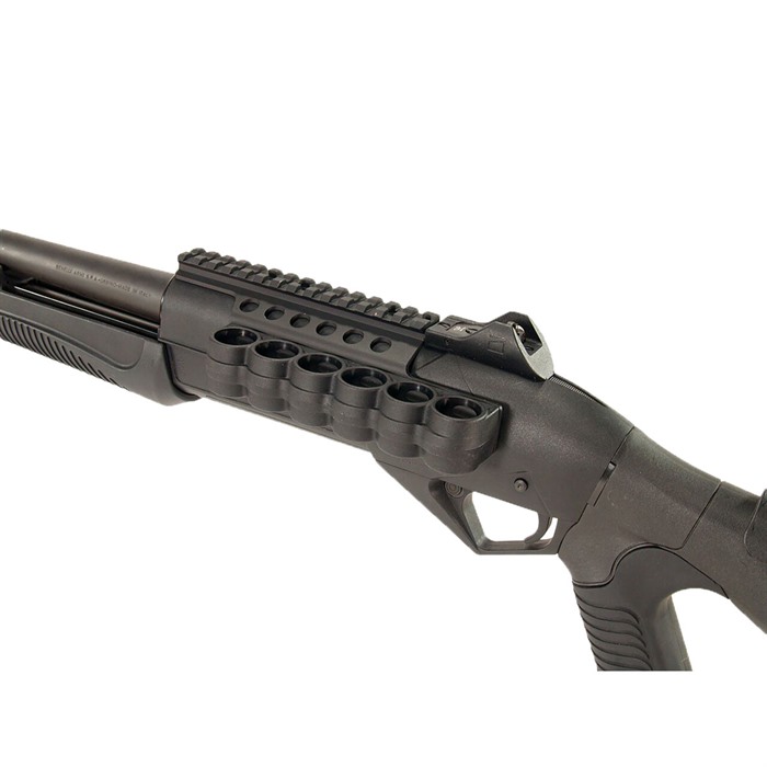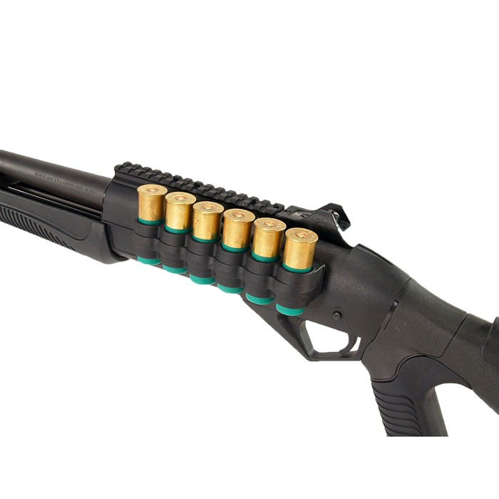 SPECS: Injection molded from glass filled polymer, lightweight aluminum backplate, matte black. For 12 gauge only. All models include mounting hardware, rubber gasket, and installation instructions. Right Hand models only. Remington Sidemount fits models 870/1100/11-87 (may require modification to gun). Rem 6-Round Sidemount – 6¼” (15.8cm) long x 1½” high. 5.4 oz. (152g) wt. Rem 8-Round Sidemount – 7¾” (19.7) long x 1½” high. 7 oz. (200g) wt. Remington Picatinny fits models 870/1100/11-87 (may require modification to gun). 7” (15.8cm) long x 2½” (6.3cm) high. 7.6 oz. (215g) wt. Mossberg fits models 500/590. 6-round ony. 6-3⁄8" (16.2cm) long x 1-3⁄8" (3.5cm) high. 5.2 oz. (147g) wt.Benelli Sidemount fits M1/M2/M3. Benelli 6-Round Sidemount – 6” (15.2cm) long x 2½” high. 6.3 oz. (179g) wt. Benelli Picatinny available for M2 (requires drilling tapping receiver to fit M1), M4/M1014, and Supernova. Benelli M2 6-Round Picatinny – 6” long x 2 (5.1cm)” high. 7.4 oz. (210g) wt. Benelli M4/M1014 6-Round Picatinny – 6” long x 2” (5.1cm) high. 7.5 oz. (213g) wt.