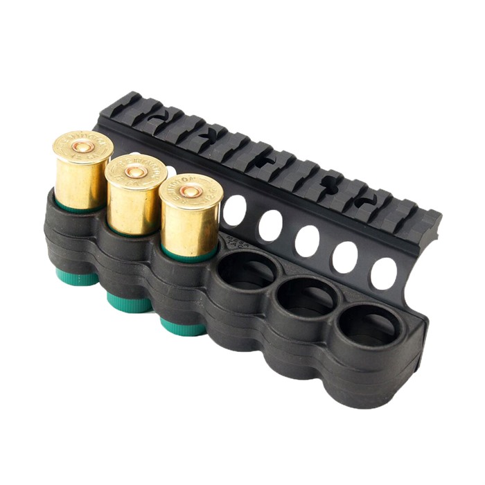SPECS: Injection molded from glass filled polymer, lightweight aluminum backplate, matte black. For 12 gauge only. All models include mounting hardware, rubber gasket, and installation instructions. Right Hand models only. Remington Sidemount fits models 870/1100/11-87 (may require modification to gun). Rem 6-Round Sidemount – 6¼” (15.8cm) long x 1½” high. 5.4 oz. (152g) wt. Rem 8-Round Sidemount – 7¾” (19.7) long x 1½” high. 7 oz. (200g) wt. Remington Picatinny fits models 870/1100/11-87 (may require modification to gun). 7” (15.8cm) long x 2½” (6.3cm) high. 7.6 oz. (215g) wt. Mossberg fits models 500/590. 6-round ony. 6-3⁄8" (16.2cm) long x 1-3⁄8" (3.5cm) high. 5.2 oz. (147g) wt.Benelli Sidemount fits M1/M2/M3. Benelli 6-Round Sidemount – 6” (15.2cm) long x 2½” high. 6.3 oz. (179g) wt. Benelli Picatinny available for M2 (requires drilling tapping receiver to fit M1), M4/M1014, and Supernova. Benelli M2 6-Round Picatinny – 6” long x 2 (5.1cm)” high. 7.4 oz. (210g) wt. Benelli M4/M1014 6-Round Picatinny – 6” long x 2” (5.1cm) high. 7.5 oz. (213g) wt.