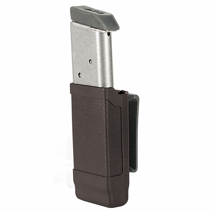 The Blackhawk Single Mag Case provides quick and easy access to spare magazines while maintaining adequate retention. Using a built-in tension spring, the Blackhawk Single Mag Case hold magazines of various sizes securely in place. Made of durable injection molded polymer Adjustable belt-clip hook Accepts 9mm, .40, .45, 10mm, and .357 Sig mags The Blackhawk Single Mag Case uses an adjustable belt-clip hook to accommodate belts of different widths.