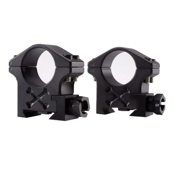 SPECS: 7075 T6 aluminum, hardcoat anodized, matte black, with 303 stainless steel screws, black finish. 1.9" (5cm) wide, .665" (16.8mm) thick. Models available for 1" (2.5cm) or 30mm O.D. scope tubes. Heights measured from top of base to center of ring: Low - 1" (2.5cm); High - 1.275 (3.2cm).
