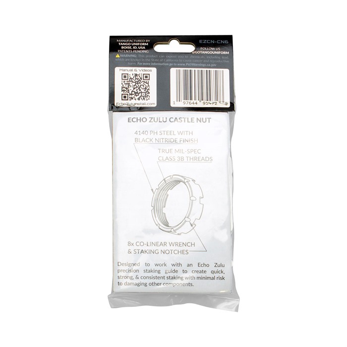 Echo Zulu Castle Nut -järjestelmä mahdollistaa AR:n castle nutien kiinnittämisen nopeammin, turvallisemmin ja johdonmukaisemmin. Patenttihakemus on vireillä EZ castle nut on valmistettu korkealaatuisesta 4140 PH -seosteräksestä ja viimeistelty pitkäkestoisella, timanttikovuudella mustalla nitraatilla.