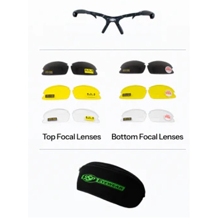 SSP Eye Wearin TOP FOCAL® ULTRA KIT INTERCHANGEABLE SHOOTING GLASSES tarjoaa kattavan ratkaisun ampujille, opettajille, mekaanikolle, sähköasentajille ja lukijoille. Tämä monikäyttöinen sarja sisältää sekä ylä- että alafokaaliset linssit, jotka takaavat kirkkaan näkymän ja vähentävät niskajännitystä.