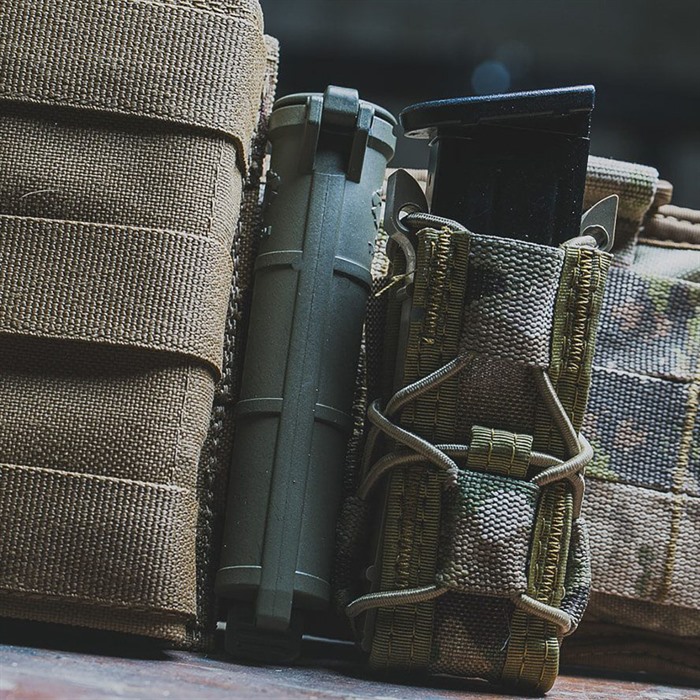 - Ohut pystysuora profiili, joka on alle 1 MOLLE-verkkosarakkeen leveä, vapauttaa tilaa muille varusteille, kuten ensiapupakkauksille, patruunoille ja työkaluilla