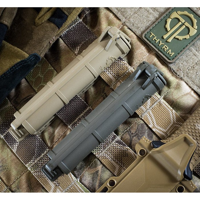CELLVAULT BATTERY STORAGE FOR AAA AND CR123 The CellVault Battery Storage is Thyrm’s original CellVault, a space-efficient way to keep your batteries and critical gear safe, dry and accessible. It can store three CR123, four AAA, or two AA batteries, as well as small survival supplies. The CellVault Battery Storage protects batteries and other critical gear while keeping it accessible and organized. Its integrated webbing clip allows you to access the CellVault’s contents without removing it, or you can quickly detach it for more control. This is the original CellVault size. FEATURES: Mounts to PALS, MOLLE, webbing, and straps Lanyard loops at both ends, for more attachment options Slim vertical profile less than 1 MOLLE webbing column, freeing up space for other gear including first aid kits, ammo, and tools Slightly decreasing diameter that can keeps CR123 batteries at the bottom of the CellVault secure even when the CellVault is inverted. Just squeeze the sides of the tube to release CR-123s in the middle or bottom of the CellVault. Waterproof, dustproof, durable exterior keeping your essentials safe and accessible Designed and manufactured in the USA Colors: black, Olive Drab, Rescue Orange, Flat Dark Earth, Urban Grey, or clear with black hinge. Viewable contents through clear model A CellVault can store: Three CR123 batteries Four AAA batteries Two AA batteries (leaving a little extra room) Small survival gear such as matches, hooks and line, a light stick, iodine tablets, a compass, and lip balm First aid gear including hemostatic clotting agents, tweezers, and bandages Consumables* such as medication, instant coffee packets, electrolyte powder, candy Emergency money and a Flash Drive Cigar/Cigarettes/chewing tobacco *If you plan to store consumables (medication, snacks) in the CellVault, wash it thoroughly and consider using a food-safe plastic bag. Clean it with a test tube or bottle brush. The CellVault is made with food-safe thermoformed plastic. This model of CellVault is not designed to be waterproof under prolonged submersion. Subsequently, it is not designed for diving. Users should check the lip and O-ring of the CellVault for debris or wear that could prevent it from being waterproof over time.