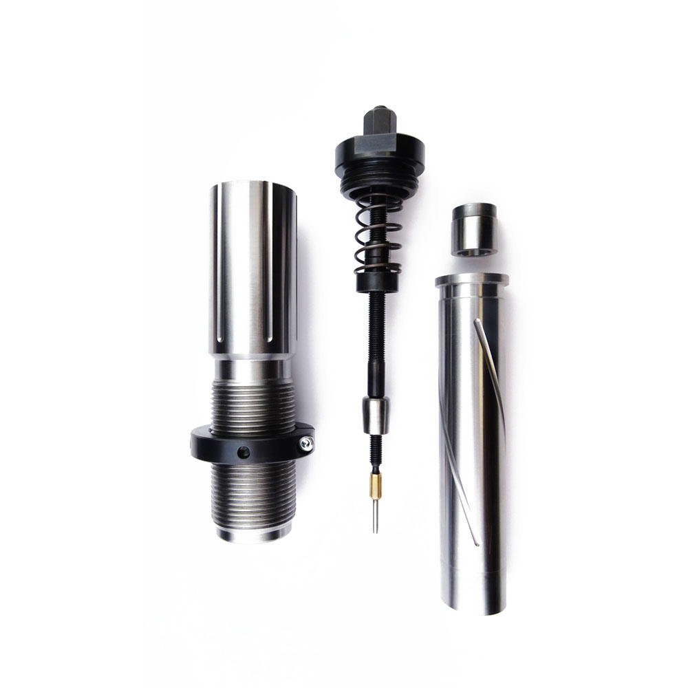 The guide sleeve and the body of this reloading-die are perfectly matched to ensure exact axial alignment of the cartridge during the sizing process.