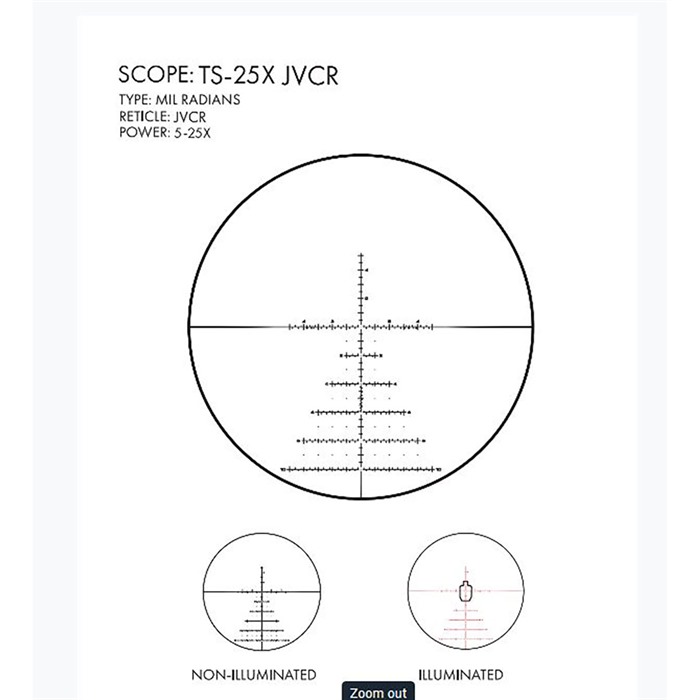 US Optics TS-25X:n rakenne suurella 30mm putkella varmistaa, että se kestää kovaa käyttöä kentällä ja jättää tilaa pitkän matkan laukauksien vaatimille lisäsäätöille. Saatavilla joko Carolina Mil Scale tai JVCR ristikolla, TS-25X tarjoaa valaistuksen, joka merkitsee selkeästi keskikohtaa helpottamaan tähtäystä kaikissa valaistusolosuhteissa. Riippumatta siitä, minkä mallin valitset, kaikki TS-25X ristikkot ovat ensimmäisessä fokalitasossa, joten tiedät, että ristikossa olevat alatyypit ovat tarkkoja kaikilla suurennusvoimilla.