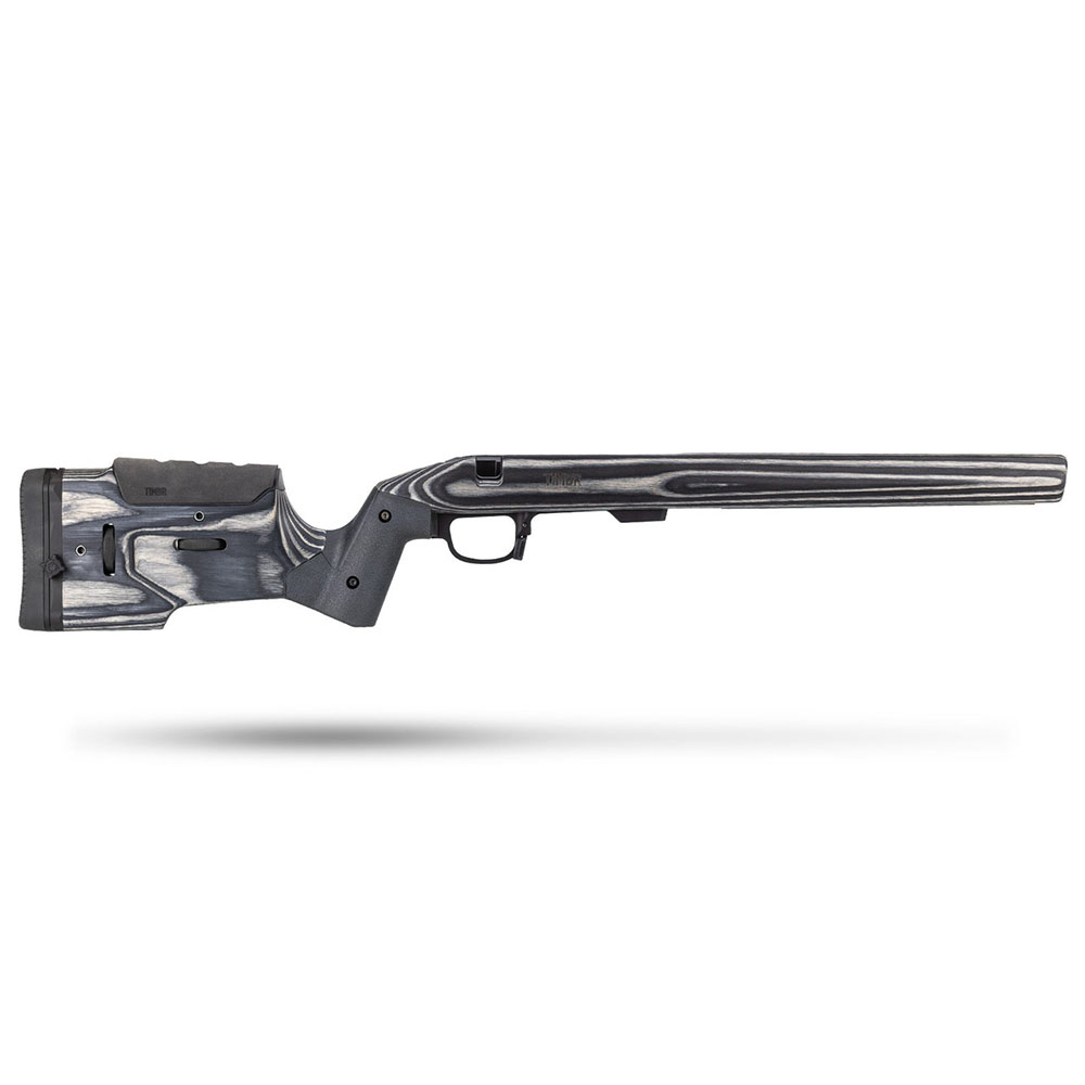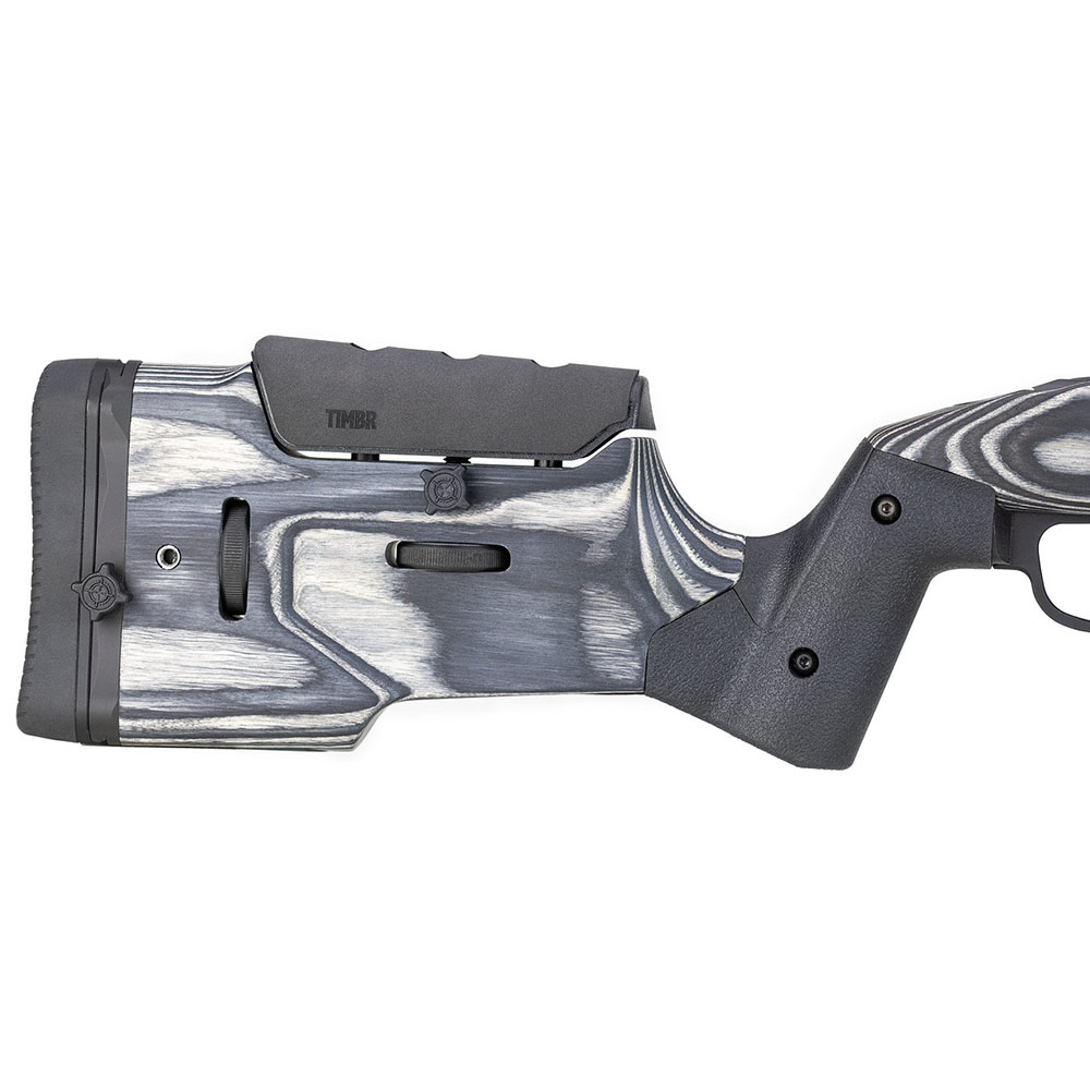 The MDT Timbr Frontier has been developed to provide the look and feel of a traditional stock while incorporating the precision and repeatability of the modern V-Block bedding from a chassis. The buttstock and forend are made of Birch hardwood laminate giving every stock a unique wood grain and warm feel. They are then finished with a high-quality clearcoat and attached to the aluminum micro chassis and bottom metal.