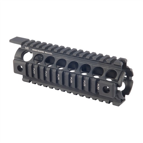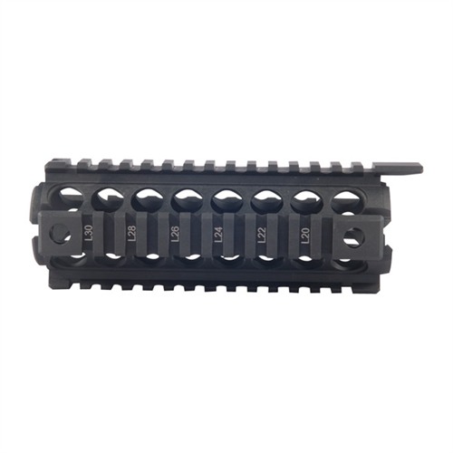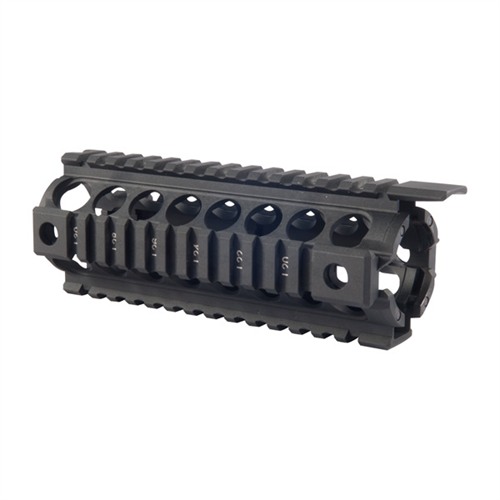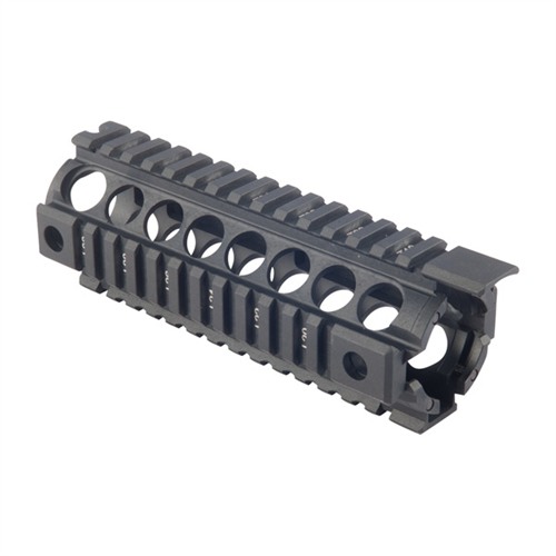 Carbine length, two-piece vented forearm snaps solidly in place and replaces factory plastic handguard with no gunsmithing, no permanent alterations to rifle. Each of the four MIL-STD 1913 Picatinny rails contains 15 mounting slots for optics, lasers, vertical grips, bipods, and lights. Two-piece design permits removal of lower section to install a grenade launcher or shotgun. Both pieces remove easily for cleaning and maintenance. Rails are laser etched with white alphanumeric position markings to aid in fast mounting and remounting of optics and accessories. Large vent holes allow plenty of air circulation for barrel. Models available to fit standard AR-15/M4 carbine.