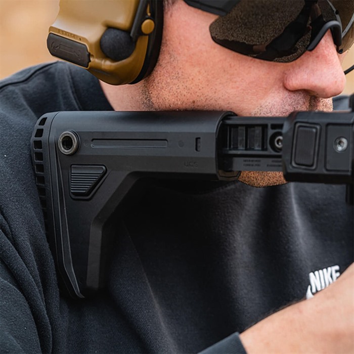 MAGPUL® UCS™ ADJUSTABLE CARBINE STOCK FOR AR-15 The Magpul UCS (Universal Carbine Stock) is designed to be the ideal supplement to the vast array of firearms utilizing a vertical M1913 Picatinny rail on the rear of the receiver for stock fitment. To accommodate the wide variety of charging handles styles, ejection port locations, and control locations, the UCS features a reversible hinge for left and right folding configurations, and five degrees of drop for clearance. The UCS ships with two reversible Cheek Risers (0.50", and 0.75"), and when combined with the reversible M1913 clamp (allowing for a 1/2-slot height adjustment), the shooter can dial in head placement for an optimal sight picture using iron sights or optics. Offering three (3) inches of length of pull (LOP) adjustment spanning six (6) positions – which can be adjusted via the LOP buttons – the stock fits any shooter, with and without armor or other bulky equipment. The UCS also includes a reversible, anti-rotation QD socket for sling attachments, and is compatible with MOE SL® and DT Butt-Pads. Made in the USA. FEATURES PROVIDES EXTREME ADJUSTABILITY Six (6) position, push-button LOP adjustment allows three (3) inches of total adjustment Toolless, removeable and reversible Cheek Risers for comb height adjustment (0.50" and 0.75") Reversible M1913 clamp allowing for a ½-slot height adjustment for further stock height adjustment ADAPTABLE TO MULTIPLE PLATFORMS Compatible with all firearms with an M1913 rail on the rear of the firearm’s receiver 5° drop angle for charging handle and ejection port clearance Reversible folding mechanism to modify folding direction SHOOTER CONFIGURABLE Reversible, anti-rotational QD socket for sling attachment Compatible with MOE SL and DT Butt-Pads Designed to fit shooters with or without bulky gear SPECS LOP Adjustment Range: 3 in. Length: 7.6 - 10.6 in. Length of Pull:Exact LOP range varies depending on platform* Height at Butt Plate: 5.3 in. Weight: 1.1 lbs Width, max:1.9 in. (at hinge) COMPATIBILITY Receivers equipped with an M1913 rail instead of a buffer tube from the factory, or receivers with an M1913 aftermarket adapter, including but not limited to the SIG MPX/MCX, FN SCAR, IWI Galil, CZ Scorpion, Ruger LC carbine, Brownell's BRN-180, and certain AK variants such as the PSA AK/AK-V. Exact LOP range varies, known Max/Min LOP follows: Sig MCX: 11.3 - 14.3 in. Sig MPX: 11.6 - 14.6 in. FN SCAR: 11.8 - 14.8 in. IWI Galil: 11.3 - 14.3 in. CZ Scorpion: 11.6 - 14.6 in. Ruger LC Carbine: 13.3 - 16.3 in. PSA AK: 11.7 - 14.7 in.