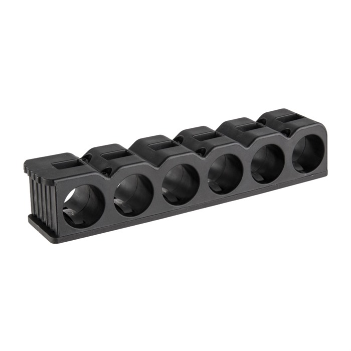 Rakennettu kaksiosaisesta järjestelmästä, Universal Detachable Shotgun Shell Carrier on suunniteltu käytettäväksi sekä Remington- että Mossberg-vastaanottimissa. Alumiininen taustalevy kiinnitetään haulikon vastaanottimeen ja siinä on tuntotappi, joka ulottuu takapään lähelle vastaanotinta. Paina vain tappi vapauttaaksesi patruunatelineen, ja uusi teline voidaan nopeasti lisätä sen paikalle.